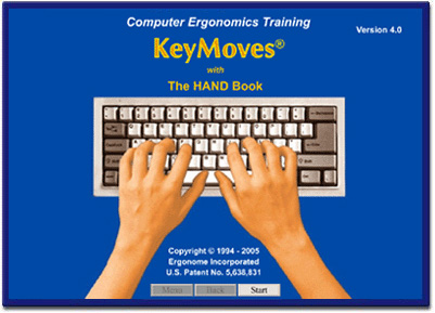 KeyMoves Software: This is the basic, preventive, self-training tool at the heart of the program. It teaches each individual employee how to adjust his or her computer workstation properly and how to type safely and comfortably on a standard keyboard. KeyMoves is based on the definitive text for correct keyboard use, "The HAND Book," by the concert pianist, Stephanie Brown.